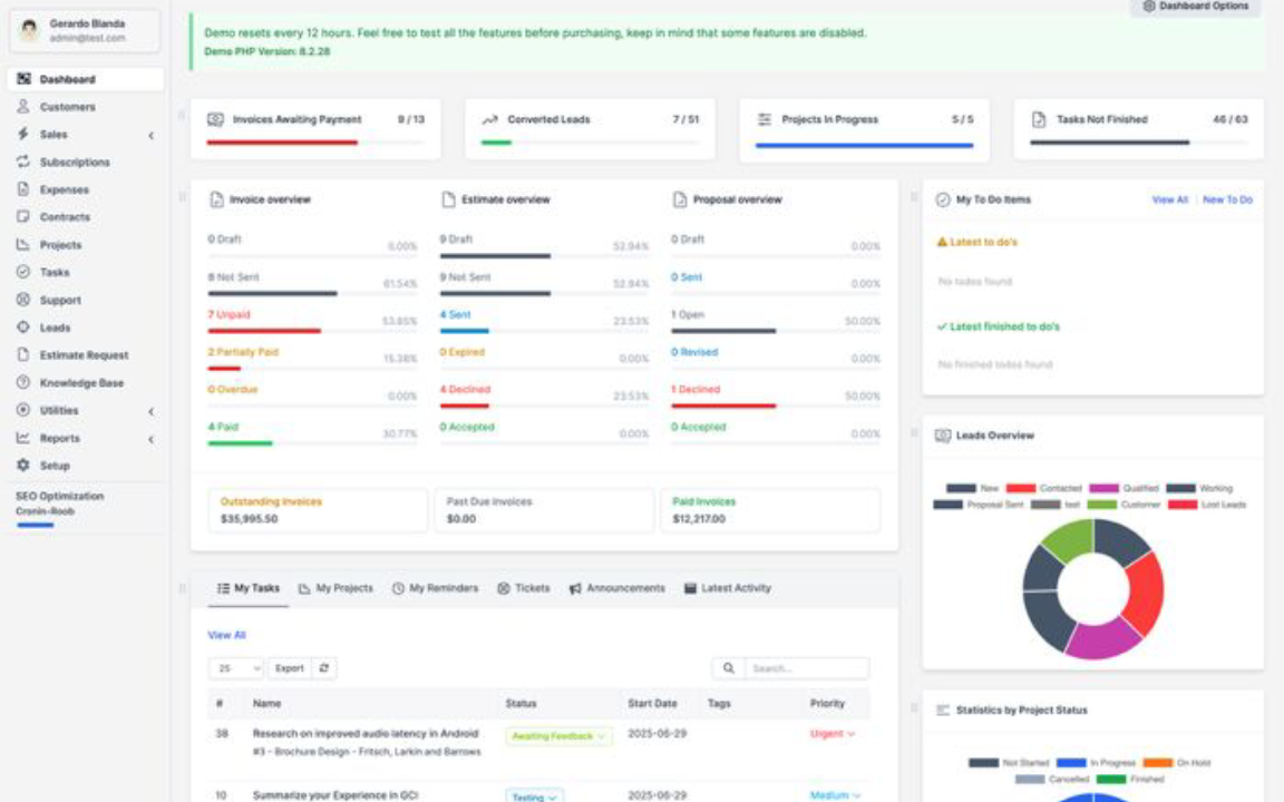 Organize clientes, leads, tarefas, projetos e faturação num único painel claro, simples e acessível para toda a equipa.